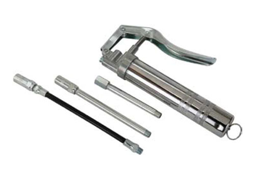 【ワンハンドグリースガン】 フレキシブルノズル付き 《機能・特徴》 片手で操作ができるので狭い場所での注油作業に最適です。 ストレートノズルとフレキシブルホースの2種類が付いているのでいろいろな場所への注油が可能です。カートリッジグリース80gを使えば、装着簡単で手が汚れません。 《仕様》 ・全長:約380mm(フレキシブルホース取り付け時) ・重量:670g ・油槽径:35.7mm ・容量:カートリッジ80cc・手詰め120cc ・最大圧力:19.6Mpa 品番:F-GG-100 PRICE ¥5,225(税込) |