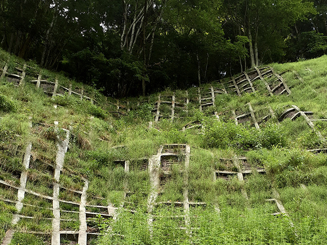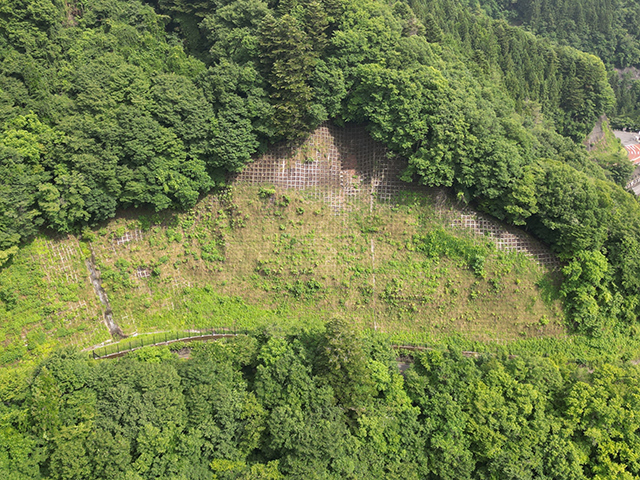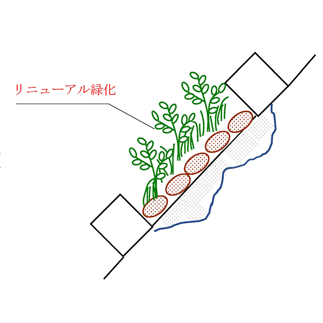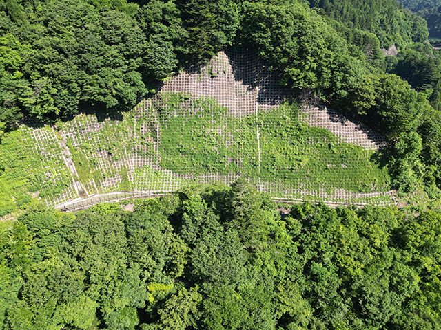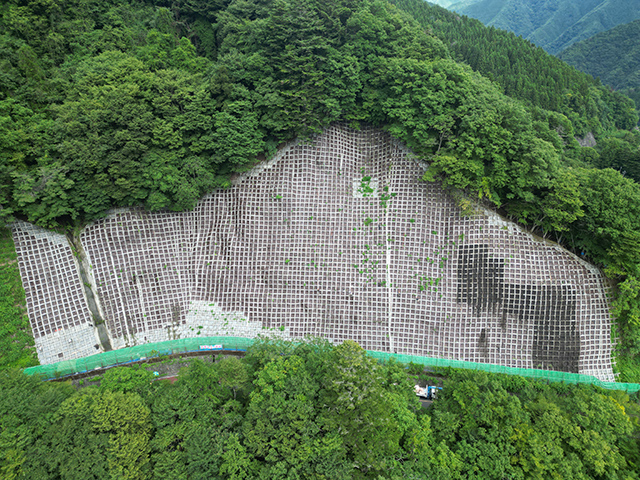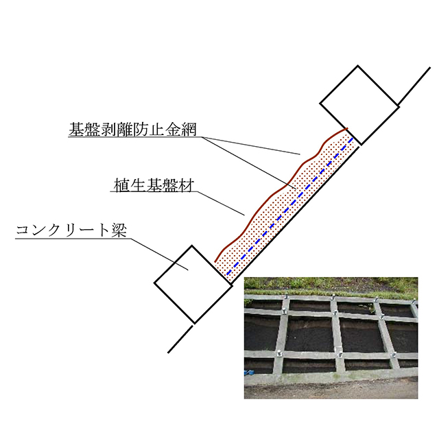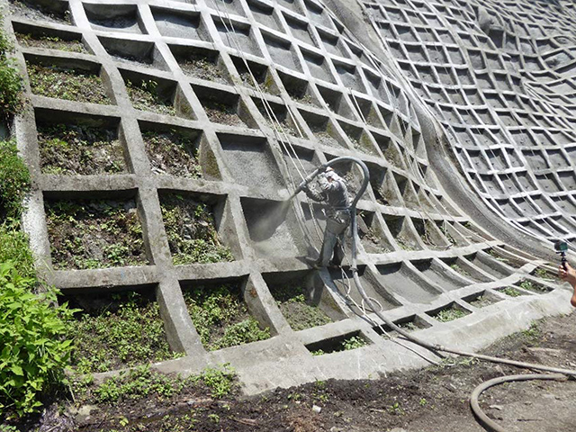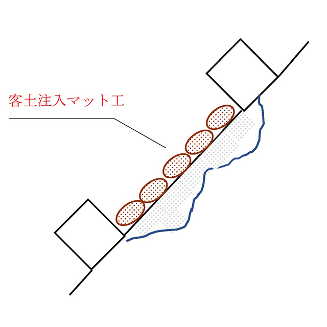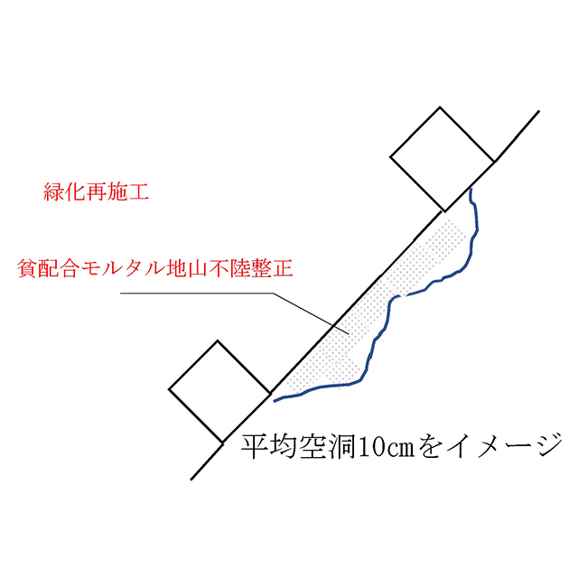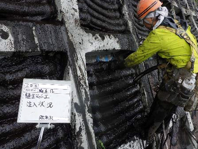 本⼯法は、そうした法⾯を貧配合モルタルによる地⼭の不陸整正と地⼭相当の強度補修を⾏い、同時に、法枠下の隙間を保護し、最後は客⼟注⼊マット⼯によって再緑化を⾏うものです。地⼭は貧配合モルタルにより、ひび割れが起きにくくなり、客⼟注⼊マット⼯により、法⾯を保護し、再緑化に繋がります。