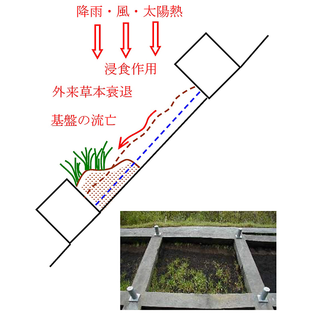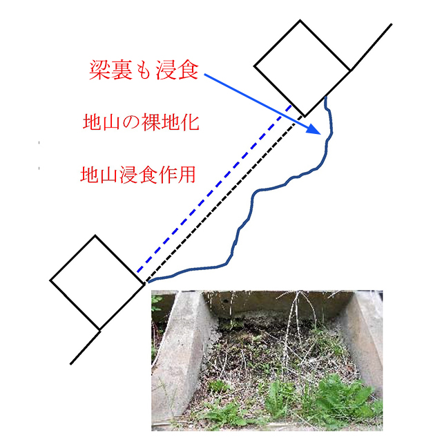 近年、過去に施⼯した緑化(主に植⽣基材吹付⼯)が、植⽣⼯(法⾯保護⼯)の役割を果たせない法⾯が増えています。本来、植⽣基材吹付⼯は、主に外来草本植物の⽣⻑により、法⾯を保護する役割があります。しかし、降⾬や⾵、太陽熱等の影響で、基盤の浸⾷作⽤が進み、外来草本の衰退、基盤の流失、法枠下に隙間が⽣じる事象が増えています。さらにそれが、地⼭の裸地化、浸⾷へと進み、状況は悪化します。